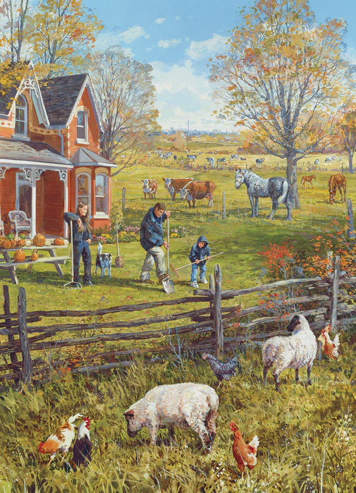 It's autumn time and the Young Family Farm is full of life! The cows, horses, sheep and chicken all look on as dad teaches his child how to shovel and rake. After they finish their yardwork, they'll carve the pumpkins that await on the picnic table.