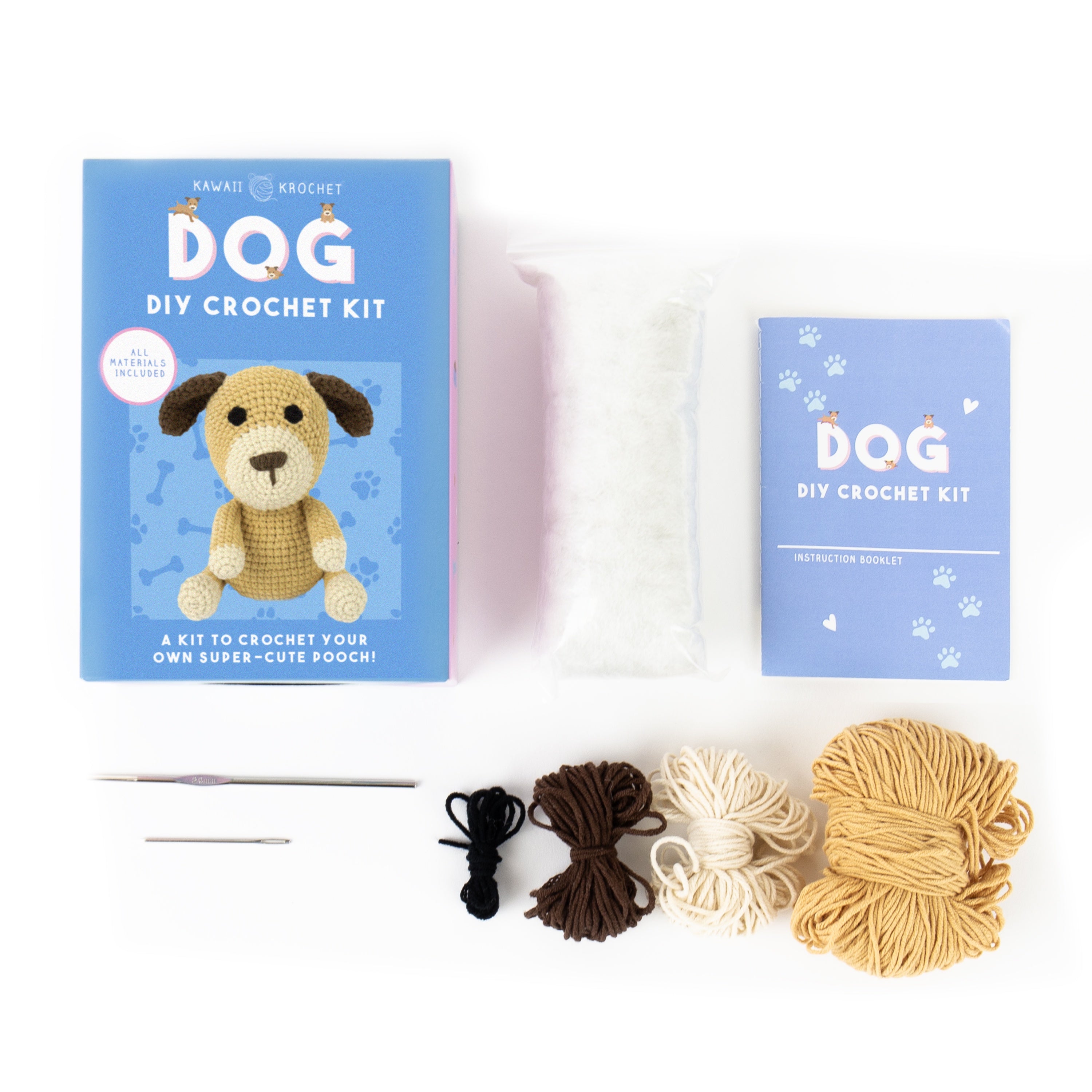 - Comes with a 2mm crochet hook, coloured wools, dog stuffing, an embroidery needle, and a step-by-step instruction booklet—everything you need to start crocheting your new furry friend.