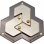 This puzzle is made up of a collection of hexagon shaped pieces, with three inside pieces and an outside frame. You slide them around inside the frame and rotate them to try to get them out of the frame. The pieces appear to have the same shape, but the exterior and interior are different.