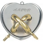 A masterpiece by metal smith Akio Yamamoto, the key word for this puzzle is 'love'. The two individually linked loops make this puzzle extremely challenging. The objective is to remove the masterfully united 'Adam' and 'Eve' loops from the metal plate crafted in the shape of the 'Forbidden Fruit'...and, if you succeed in putting them back together again, your love may just come to fruition.