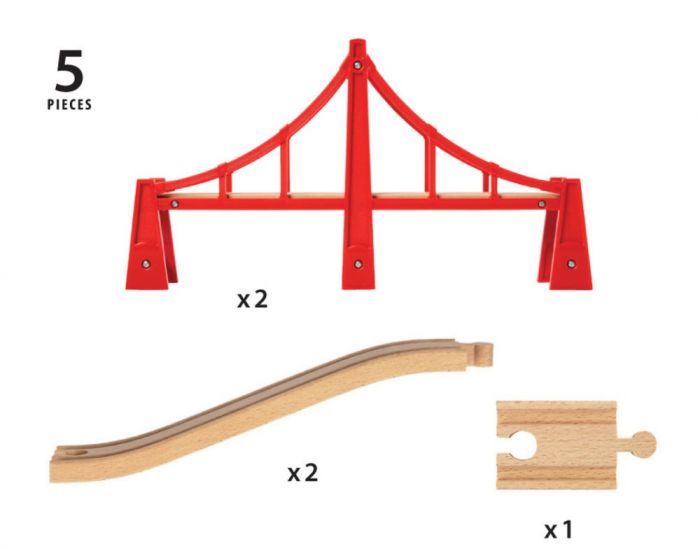 33683 Double Suspension Bridge includes 5 pieces: 2x Bridge, 2x Ascending Wooden Tracks, 1x Track.