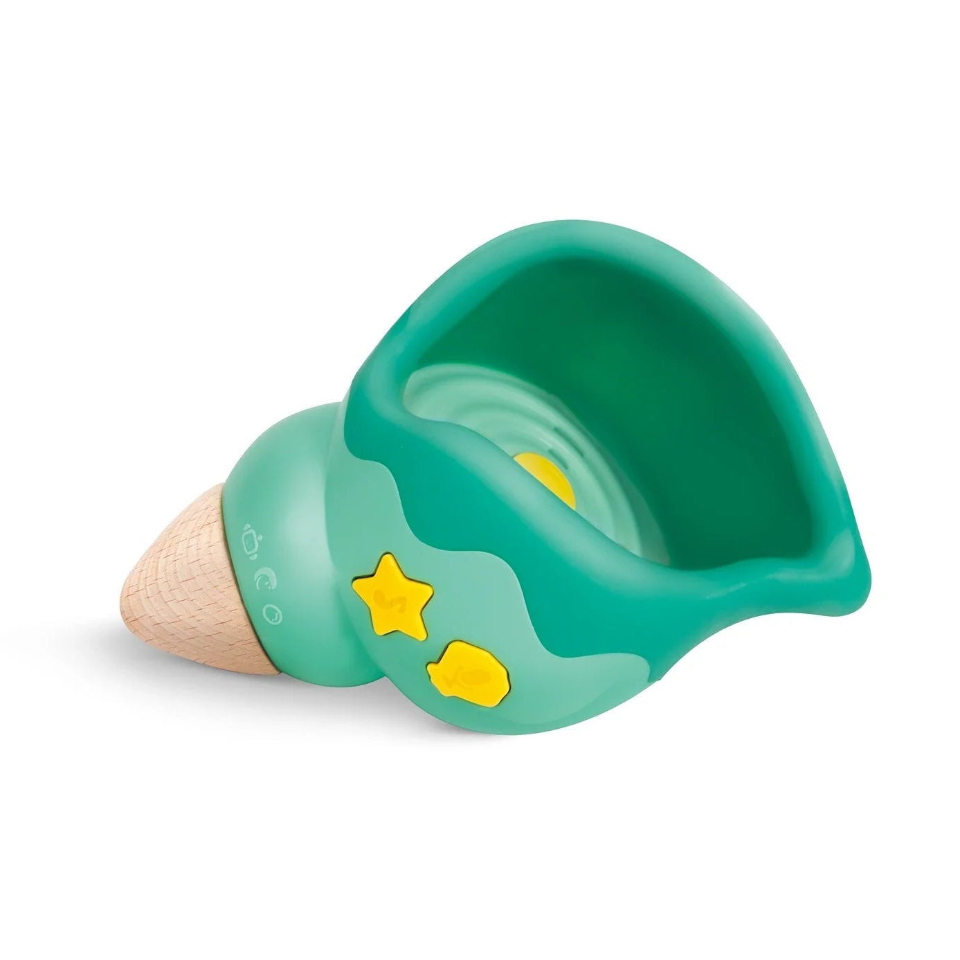 Enjoy the soothing sounds of the sea with the Magic Music Conch! Press the Star button to play five songs or hold the Shell button to record your own voice. Twist the base to change your recordings into fun effects like robot voices, ocean waves, or bubbles.