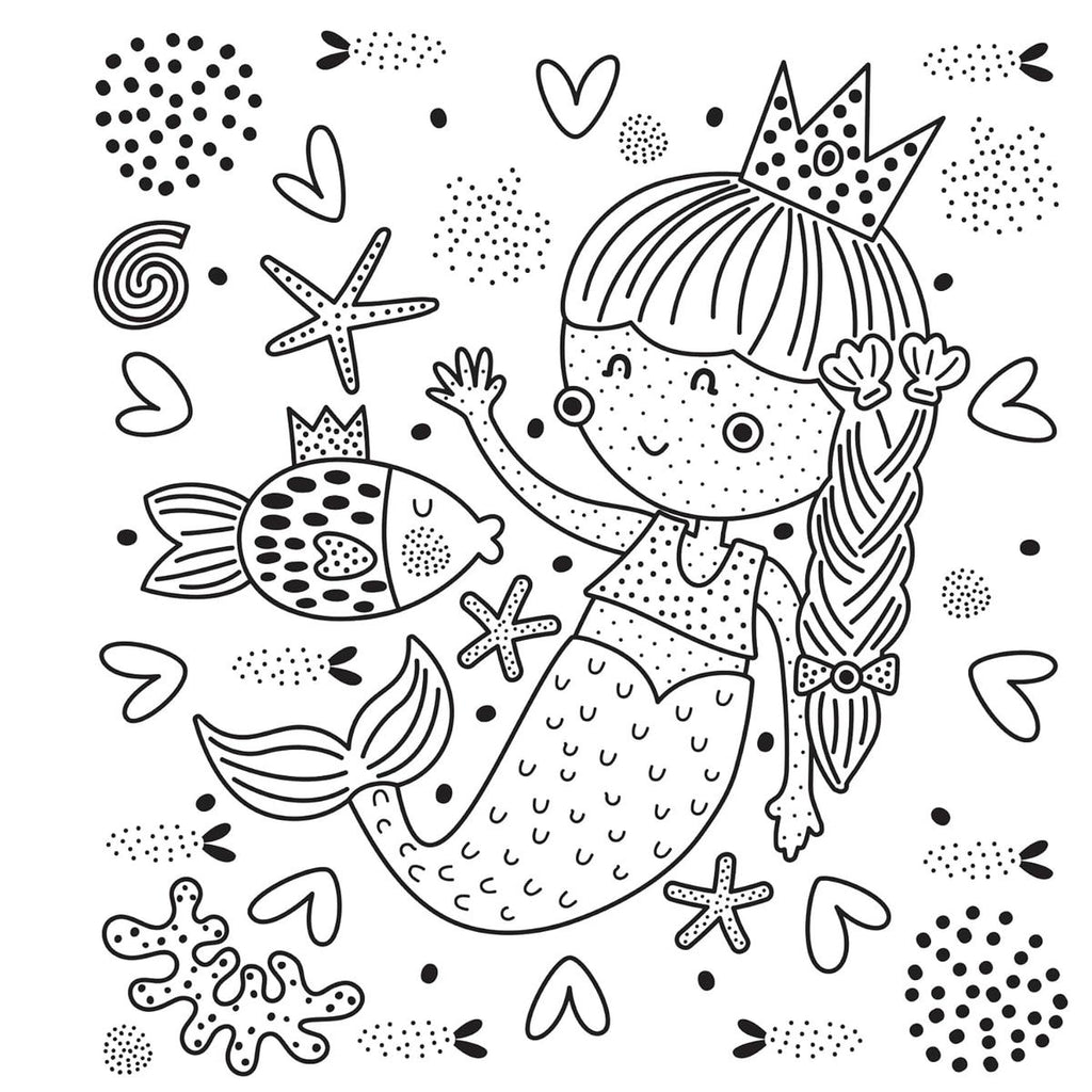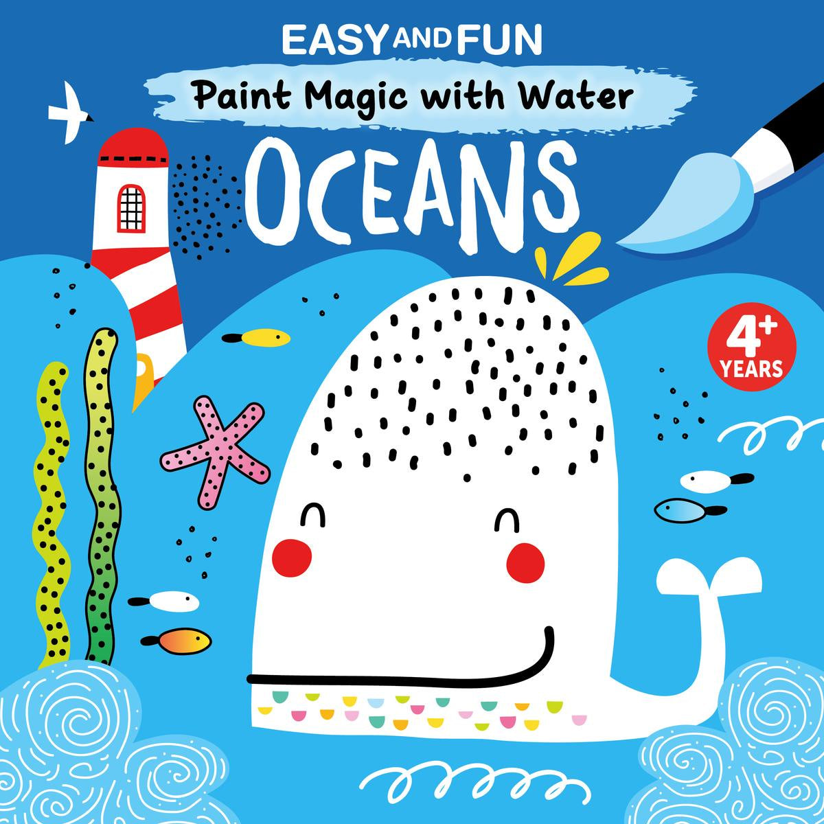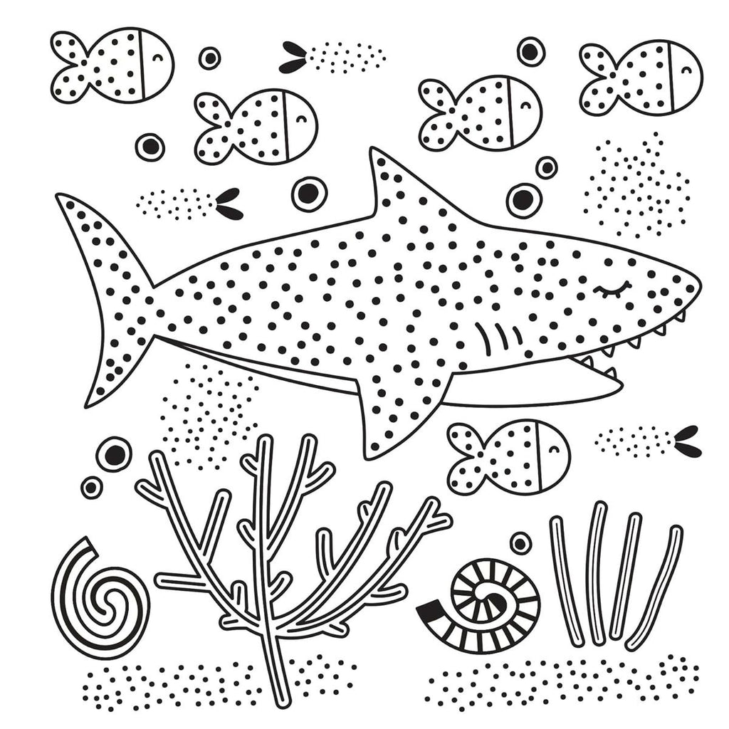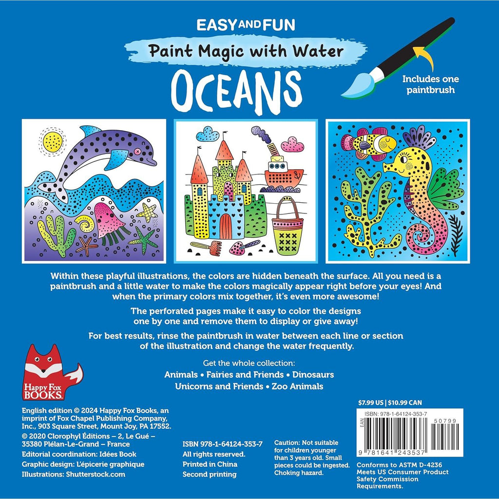 Just add water! This fun (and mess free!) paint with water activity book for kids features super cute ocean creatures and scenes. All kids need is a little water and the included brush to bring out the colors. Just simply brush over the black dots or lines in each design and watch the colors appear. Kids will be amazed to see a black and white scene filled with vibrant colors that are secretly hidden in the black line art. The paper is thick and perforated for easy removal and display! 12 watercolor for kids designs include a giant whale and shark, starfish and crabs, submarines and seagulls.