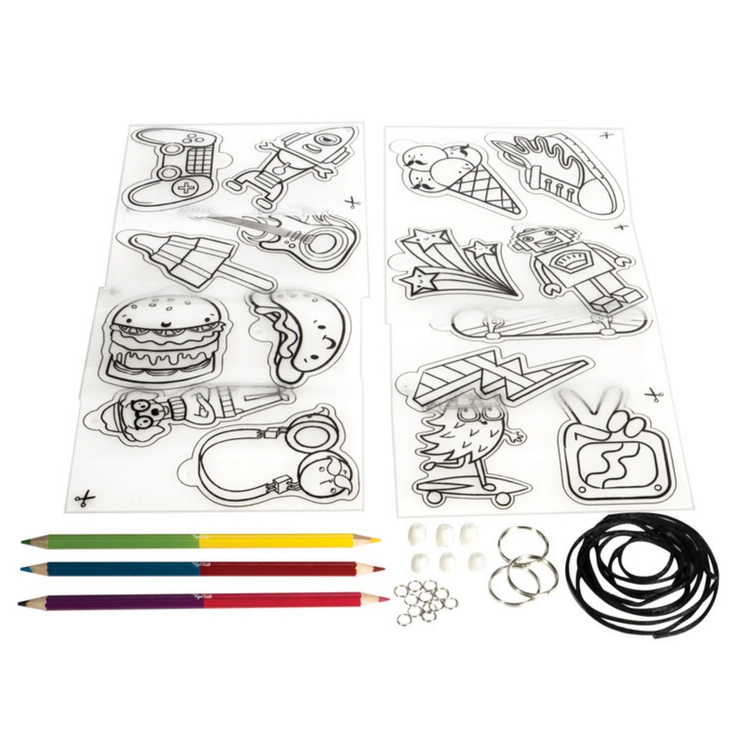 Each set includes everything you need to make your own fabulous shrink-art jewellery. Simply colour the beautifully illustrated pre-cut designs, pop them in the oven and watch them magically shrink to 40% of their original size, in front of your eyes! As your charms shrinks the colours become more intense.
