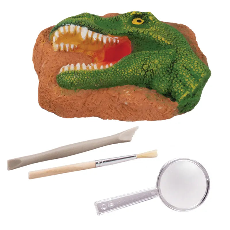 This dino fossil dig kit comes with 1 dig brick, 3 dinosaur specimens, 2 excavation tools, 1 magnifying glass and a learning guide.