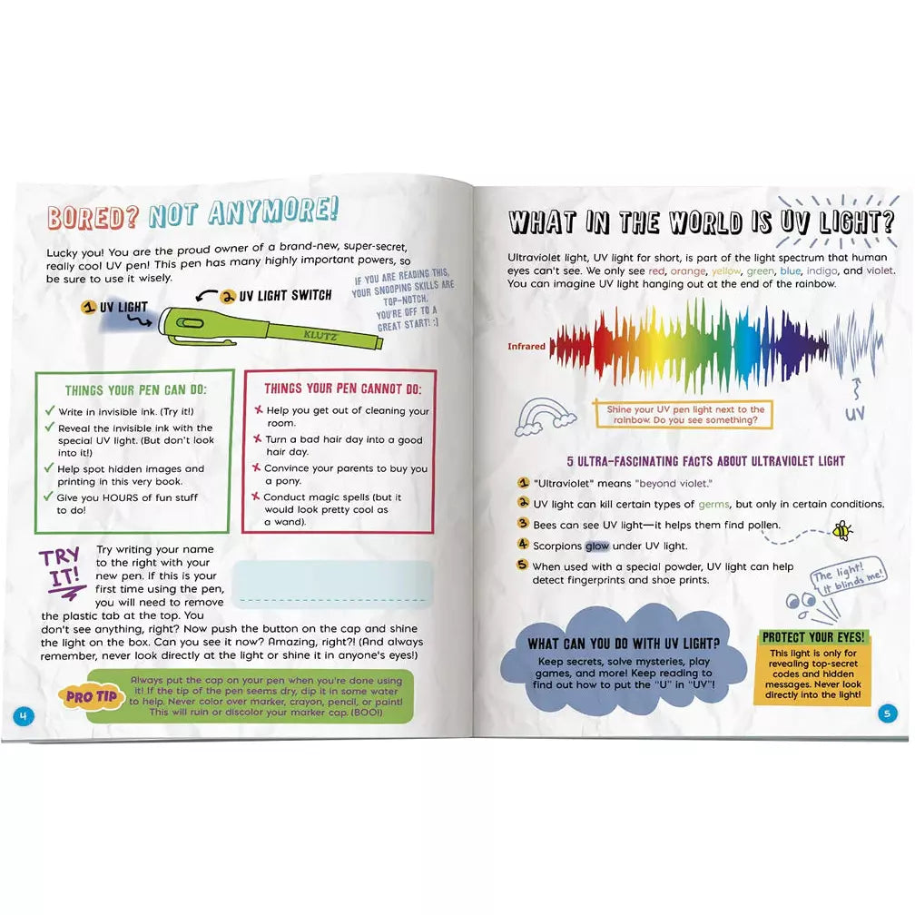 The solution is hiding in plain sight! Use the specialty pen with invisible ink and UV light to write, reveal, and uncover hidden notes and images on every page. Solve the mystery of the stolen rainbow cupcake, draw constellations in the stars, and laugh yourself silly with read-and-reveal jokes. Jam-packed with variety, this activity book helps bust even the most unbeatable boredom.