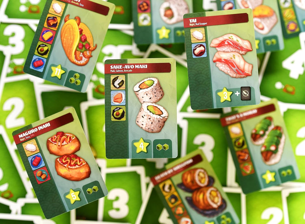 Maki Master adds new mechanisms, streamlined rules, and fresh art by Claire Lin to the Wasabi! design from 2008.
