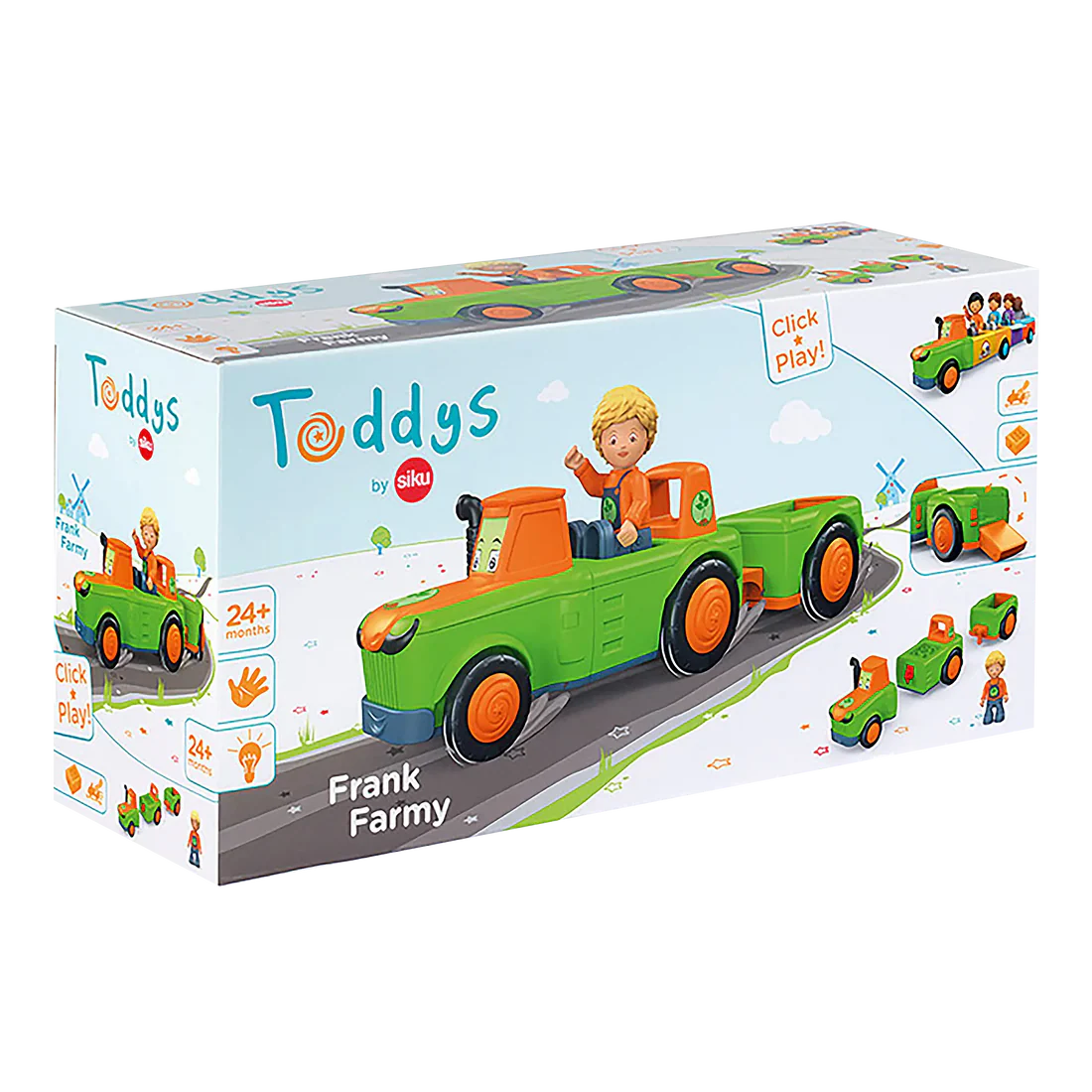 The Frank mobile figure and Farmy 3-piece vehicle are compatible with building blocks from other manufacturers. Tactile stimuli reinforce and stimulate the child's sense of touch.