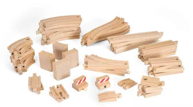 Add to your existing BRIO World railway with this expansion pack of 50 FSC (FSC-C111262) certified wooden tracks. Create bigger layouts and new adventures with straight, curved, switching and ascending tracks as well as other track accessories like ramps and stops. These wooden tracks are simple to assemble and take apart, allowing children to add new dimensions to their railway play and stimulate their logistical thinking abilities whilst building.
