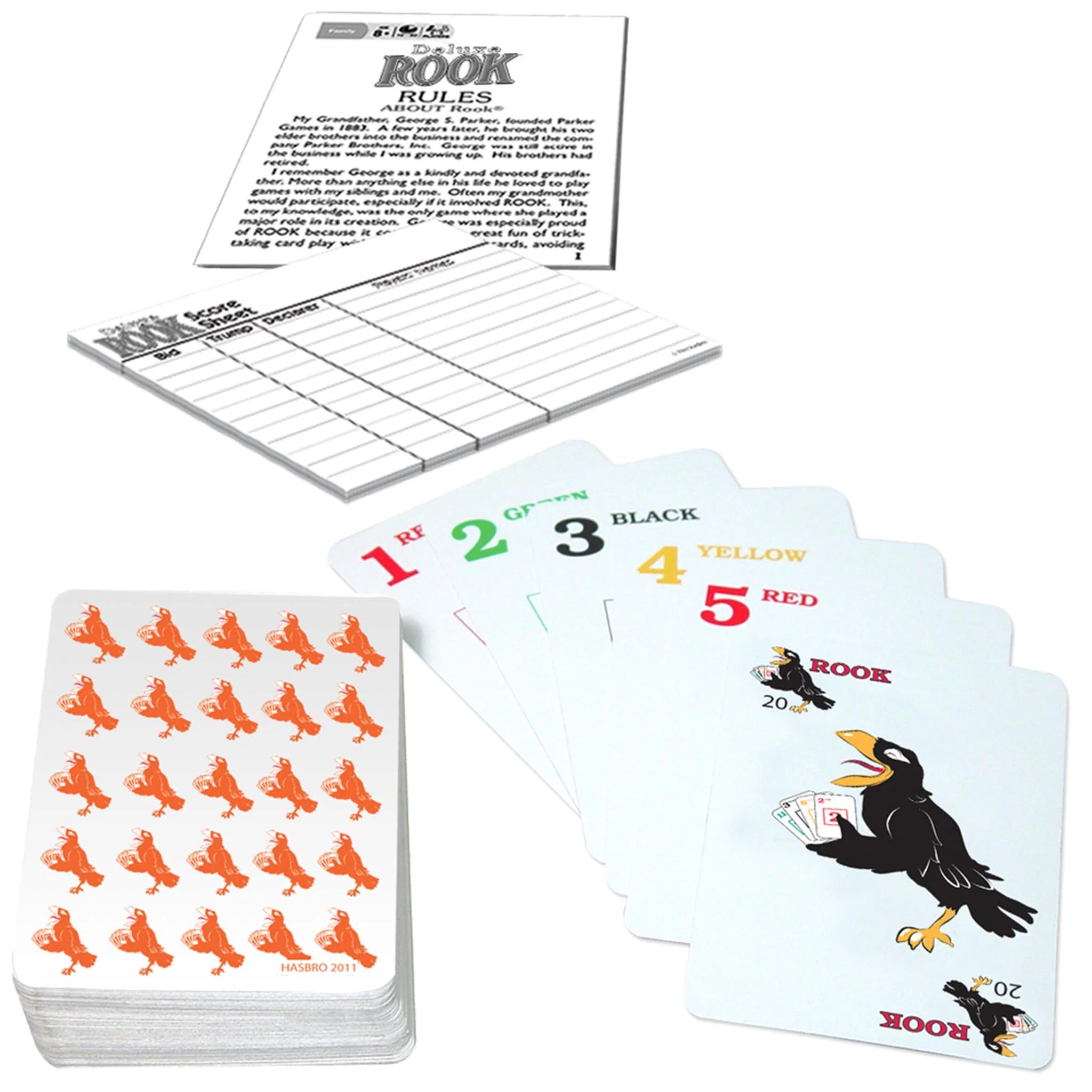 Deluxe version of the popular card game which began in 1906! Since 1906, Rook has entertained millions of card game lovers. It's much easier than Bridge, more fun than Pinochle, and more varied than Hearts. Deluxe Rook features a deck of 56 premium-quality cards and the unique ROOK Bird Card. It also includes score sheets and a 28 page book with rules for all popular Rook variations. If you're a fan of ROOK, a lover of card games, or you're looking for great wholesome, family fun, Deluxe ROOK is for you!