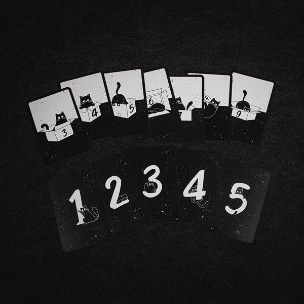 Both players have objective cards numbered 3-9, and to set up, shuffle the cat cards and lay out five piles of eight cards with the cat images on top.