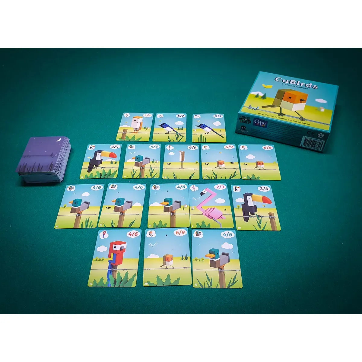 In Cubirds, players must gather birds of the same species. On their turn, they lay all identical birds from their hand on one of the fences present on the table. These birds gather with any identical birds present on the fence, making all birds placed in-between them fly into the players’ hand. With enough identical birds in hand, players can perform a flock, adding birds to their scoring area.