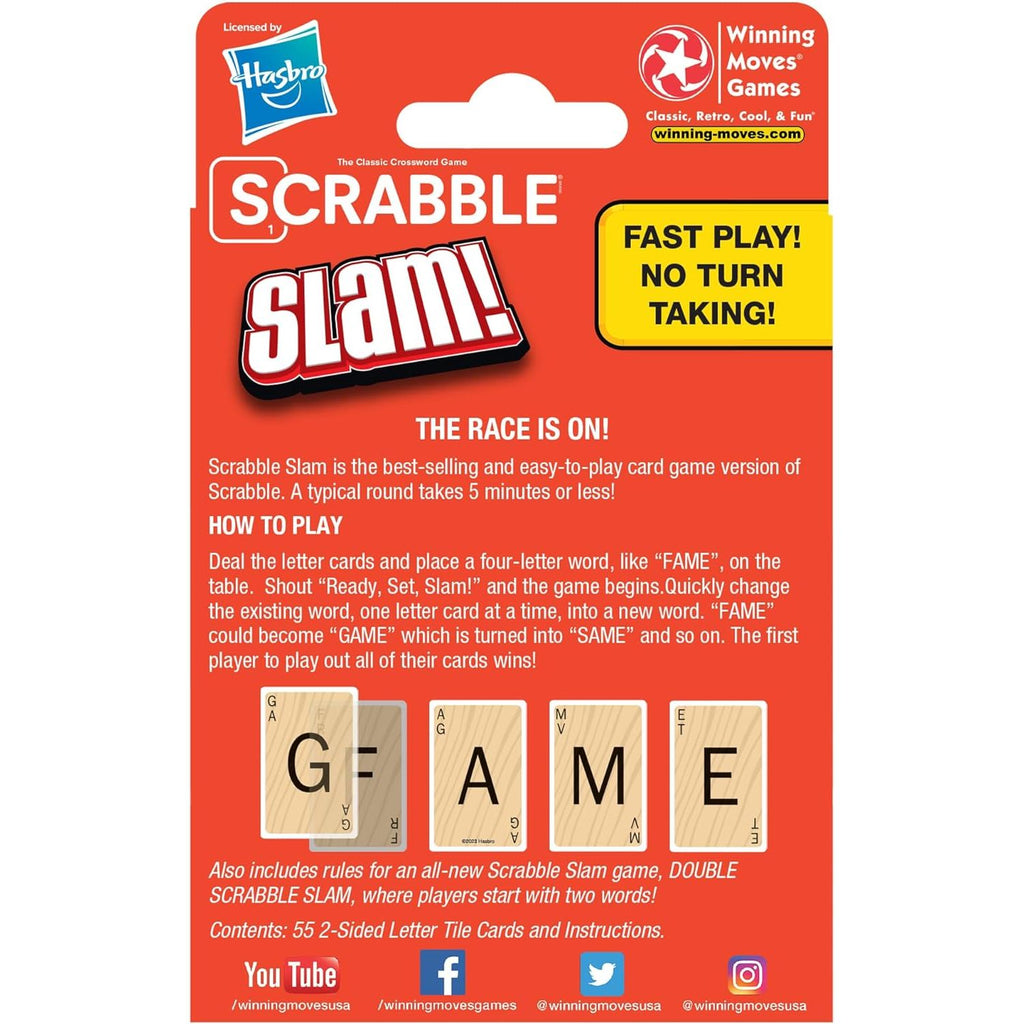 Scrabble Slam is the best-selling, fast-paced and easy to play card game version of Scrabble. Start with any 4-letter word on the table like “CAKE” and yell out “Ready, Set, Slam!” and the race is on. Quickly change the existing word, 1 letter card at a time, to create a new word like “BAKE” then change it to “BIKE” and so on. The first player to play out all their cards wins!