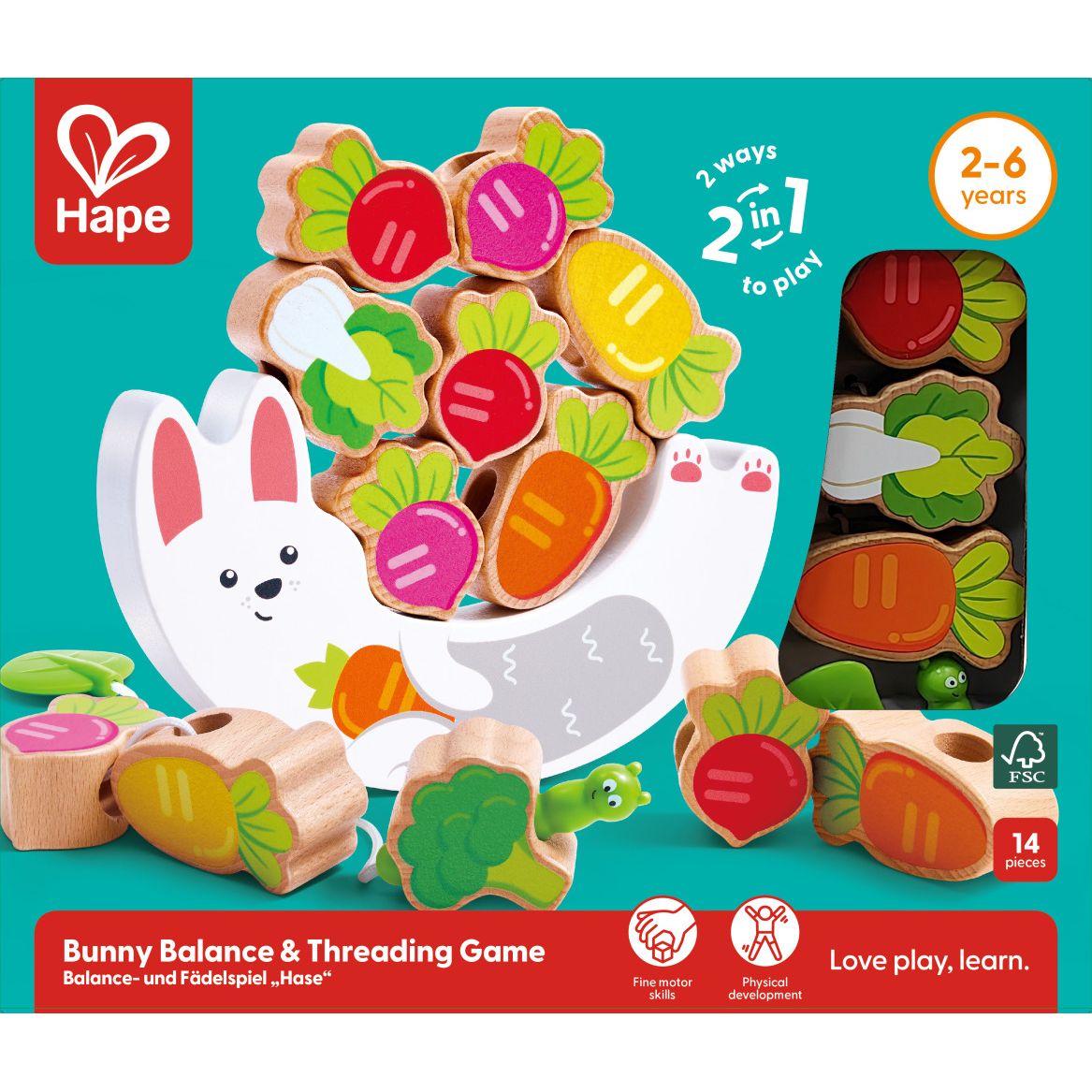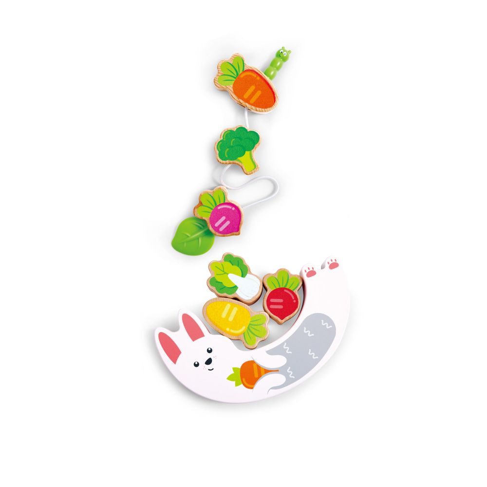 This stacking and threading game features a cute bunny and vibrant vegetable pieces, offering two engaging ways to play.