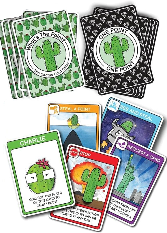 What's the Point? The cactus game of sharp moves and pointy strategies is a fast and family-friendly game where players collect sets of cacti to score points. Use action cards to outsmart your opponents - peek at their hand and steal with a See and Steal, or block their moves with a Stop card. Every turn is a chance to grow your points or sabotage someone else's. Easy to learn yet full of strategic twists, that plays between 10 to 20 minutes. It's a fun game you'll keep coming back to. Sharp, cheeky, and addictive - that's the point!