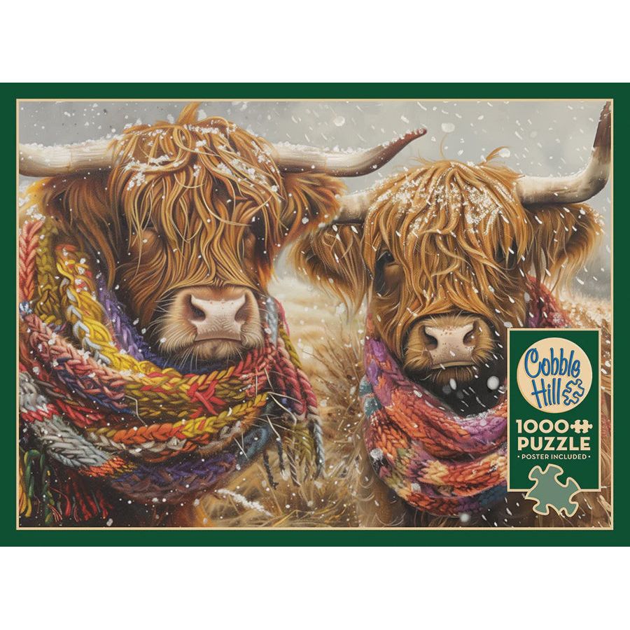 Brrr! is one of Cobble Hill's best selling images originally offered in the 500 piece count. With their 1000 piece count puzzles being extremely popular, they didn't want to freeze this image out so they made it available for puzzlers who enjoy the smaller pieces and the extra challenge. Who knew two Highland Cows wearing colourful rainbow scarves in the winer snow could warm our hearts as much as they have. Enjoy!