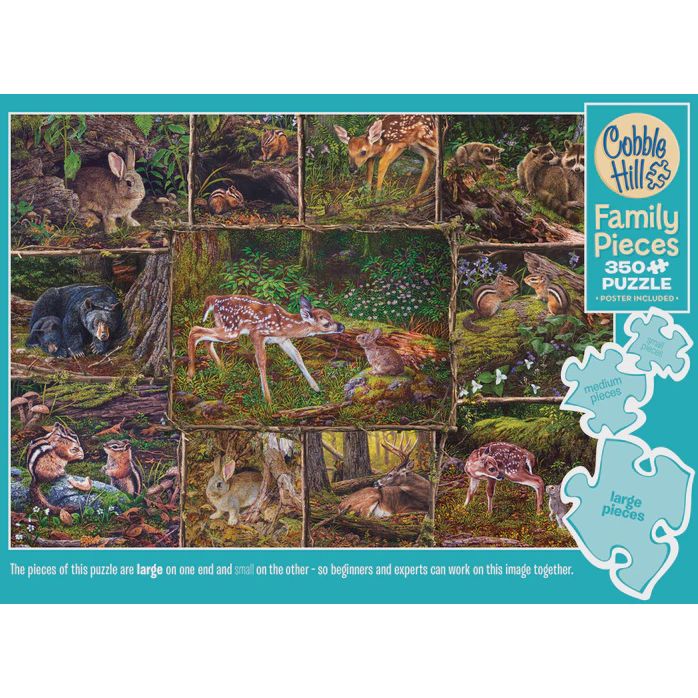Family Pieces 350 puzzles include three different piece sizes so puzzlers of all skill levels can collaborate. The large pieces are on one end of the puzzle, the medium in the middle, and the small pieces on the other end. While these puzzles are designed for families, don't let that stop you from enjoying it on your own! It's also a great option for newer puzzlers who want to step up from a 275 piece puzzle, but not ready to jump into a 500 or 1000 piece. As well, skilled puzzlers enjoy this piece count when they need a little snack break.