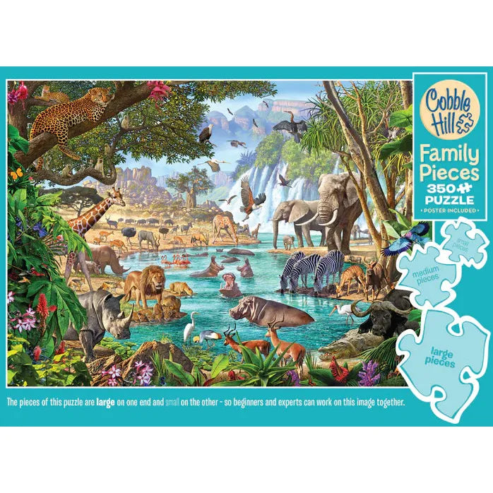 Family Pieces 350 puzzles include three different piece sizes so puzzlers of all skill levels can collaborate. The large pieces are on one end of the puzzle, the medium in the middle, and the small pieces on the other end. While these puzzles are designed for families, don't let that stop you from enjoying it on your own! It's also a great option for newer puzzlers who want to step up from a 275 piece puzzle, but not ready to jump into a 500 or 1000 piece. As well, skilled puzzlers enjoy this piece count when they need a little snack break.