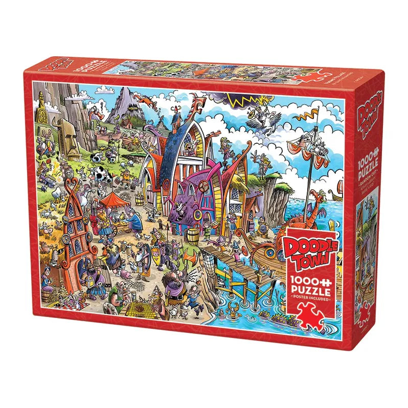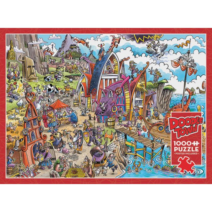 The Viking Village just received a new shipment of chaos! Come have fun exploring the island, playing chess, having tea parties with the wildlife, swimming with the sea monster, fend off some dragons, drink ale, fly away on Pegasus and whatever other ridiculous thing you can think of that Vikings do...but do they really? They do in Doodletown! Join the excitement and have some laughs along the way in this 1000 piece cartoon puzzle.