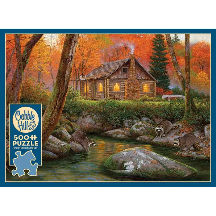 Is it a Weekend Retreat for the humans or the raccoons? They are out in full force this evening as they seek to catch some fish by the stream. It's a quiet autumn afternoon otherwise as the humans inside their log cabin enjoy a warm fire and a good book.