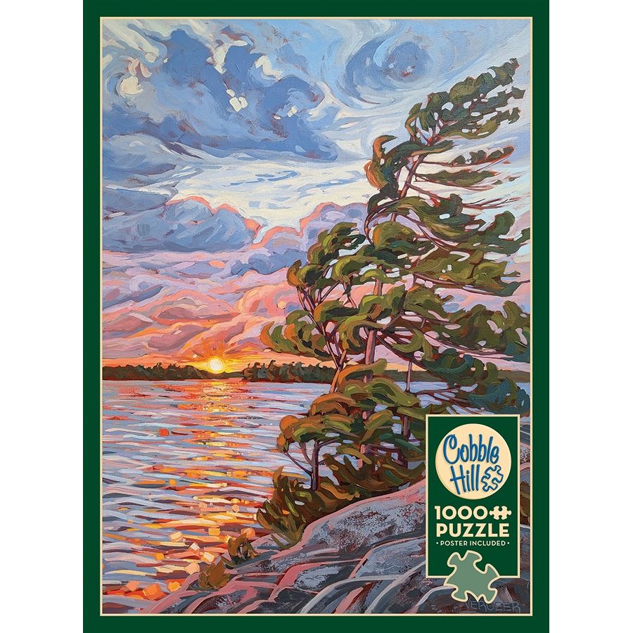 This image is a contemporary take on the classic windswept pines the Group of Seven made famous. Artist Jessica Vergeer lives and runs a gallery and store in Parry Sound. She finds inspiration exploring Muskoka and Georgian Bay. The full name of the original piece is “Granite Island Windswept” but Cobble Hill is presenting it as "Windswept" in a 1000 piece random cut puzzle. This scene manages to capture movement with the swirling clouds and wind blown trees, while also presenting a calm stillness that takes our breath away as we watch the sun set over the bay.