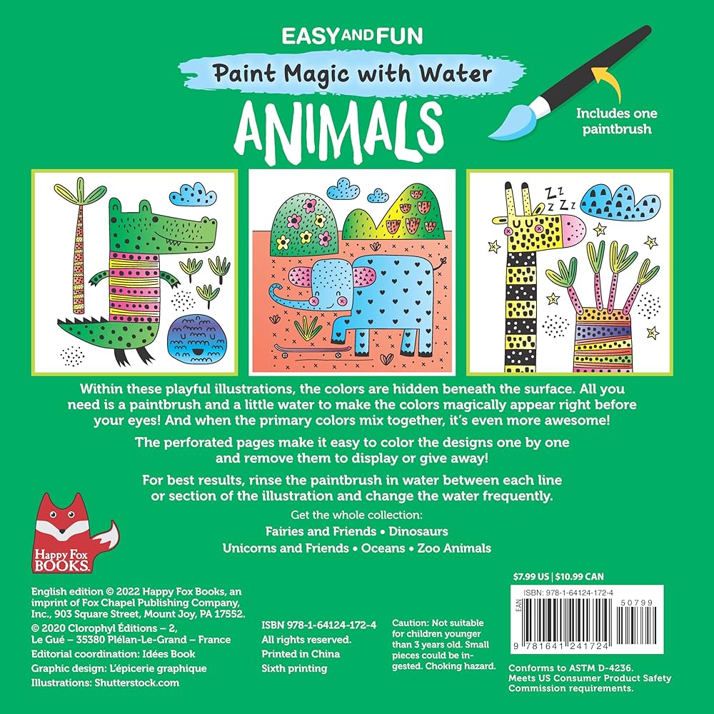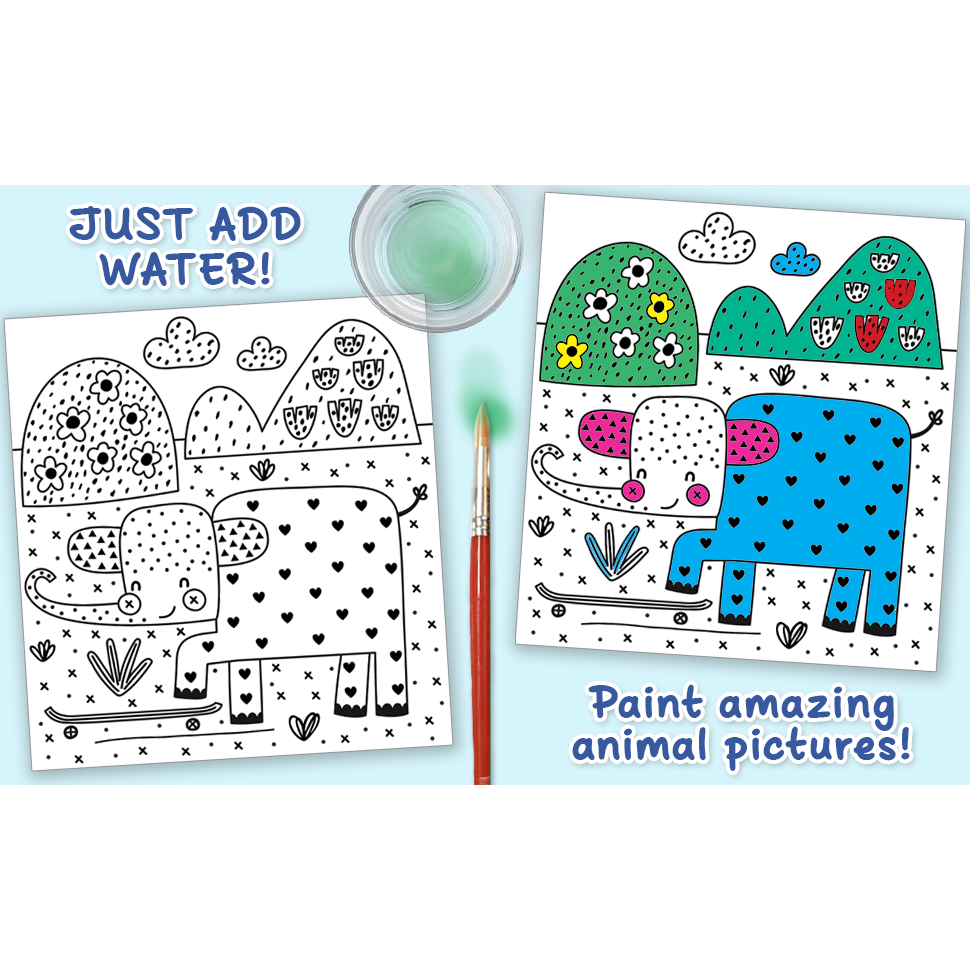Just add water and it’s like magic! A fun (and mess-free!) painting activity book for kids ages 4-6, Easy and Fun Paint Magic with Water: Animals features 12 simple and whimsical line art designs of awesome animals, from giraffes and kangaroos to iguanas, monkeys, camels, and more. Using the provided paintbrush, simply wet with water and watch the colors magically appear on each black-and-white illustration as it comes to life! With a stiff cardboard backing to prevent unwanted leaks, parents can rest assured while their children paint and have a blast using water to create stunning works of animal art! Each page within this kid’s painting book comes with perforated edges so finished artwork can be easily removed and put on display.