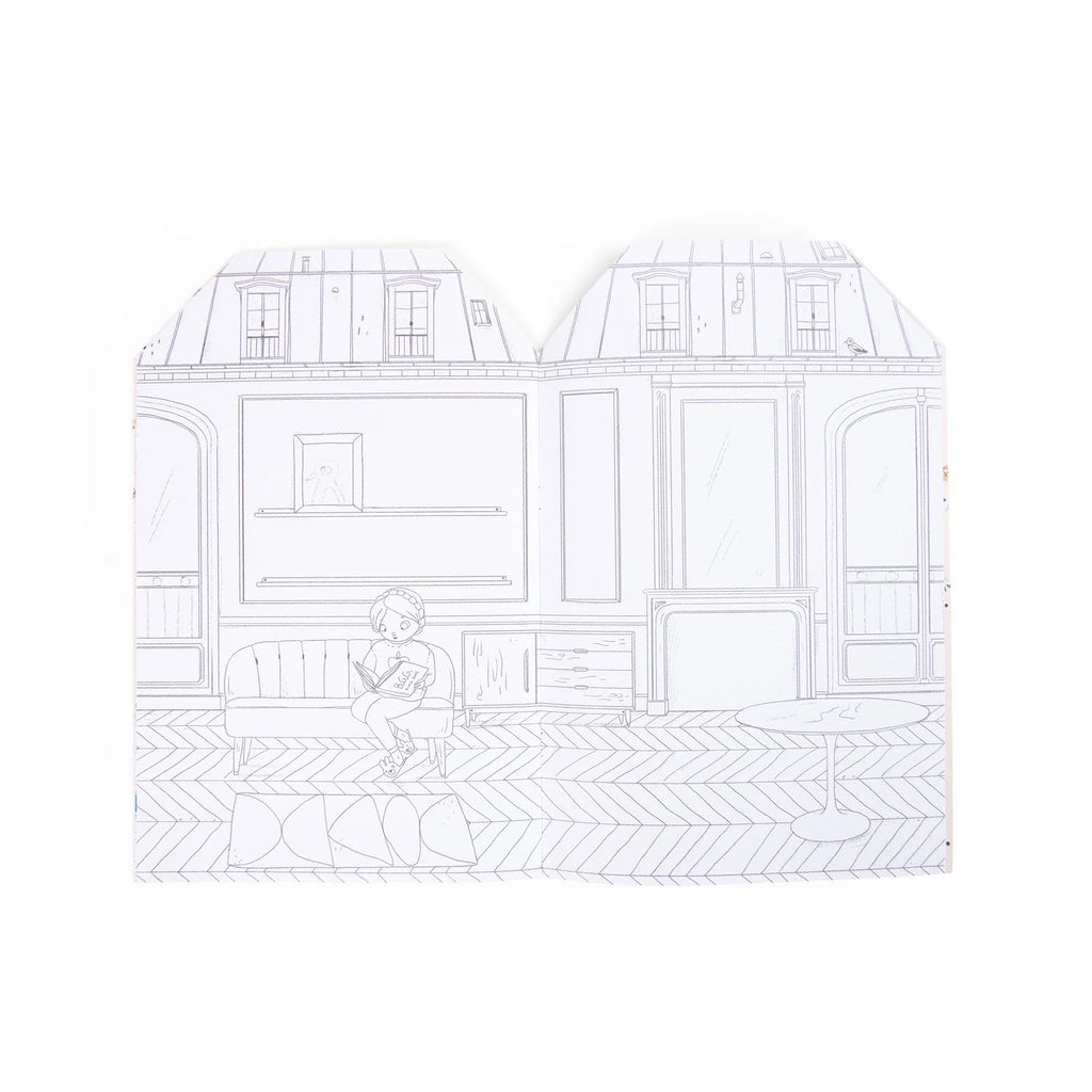 A 20-page colouring book with delicate pencil sketches, illustrated by Lucille Michieli, depicting a variety of scenes that can be brought to life with 145 coloured stickers. 5 sticker sheets featuring animals, objects, furniture and plants to create a world.