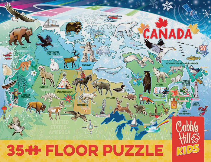 The Map of Canada Floor Puzzle has lots of wildlife to explore and makes for a fun way for kids to get to know this great country known as the Great White North. There are other great symbols to be found on the map including a totem pole in British Columbia and the maple leaf on the east coast.