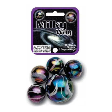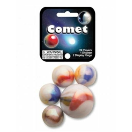 Each net comes filled with 25 glass marbles - 1 shooter (1") and 24 players (5/8"). Fun facts are printed on the inside of each header card and game rules are printed on the back of each header card. Each net contains enough marbles for 1 player plus a few extras.