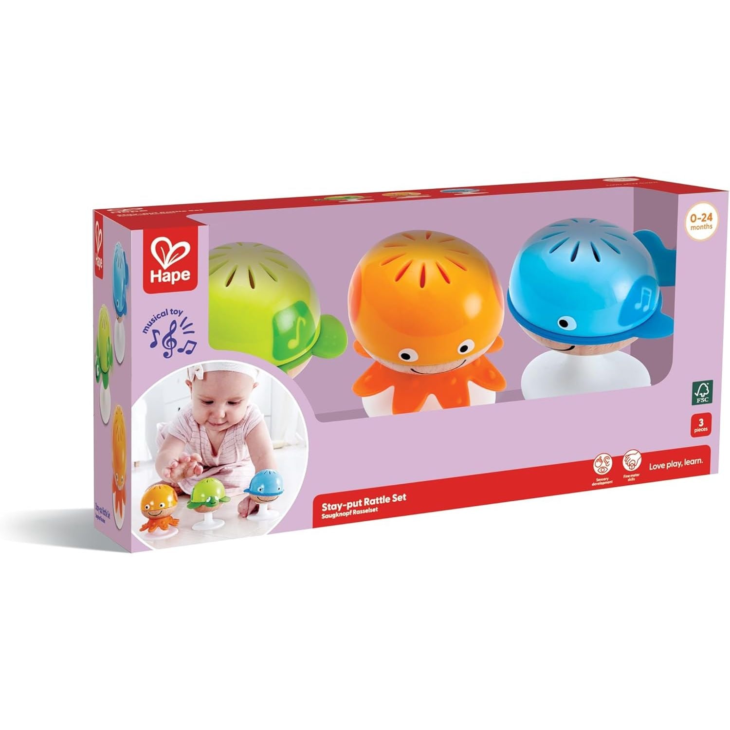 The Hape Put-Stay Rattle Set will enchant your little one with its differing sounds, bright colors and aquatic animals. Moreover, with their handy suction cups, playtime is possible anywhere, anytime!
