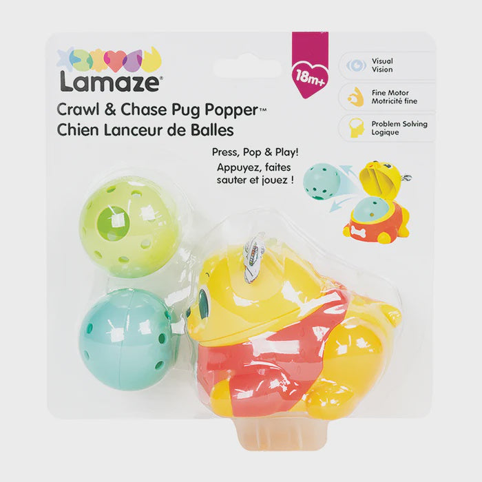 This adorable pug wants to play fetch! Press the pug over one of the two easy grip balls and immediately it pops from its mouth to roll across the room. Little ones can’t help but giggle as they jump up, chase after the ball, and do it all again!