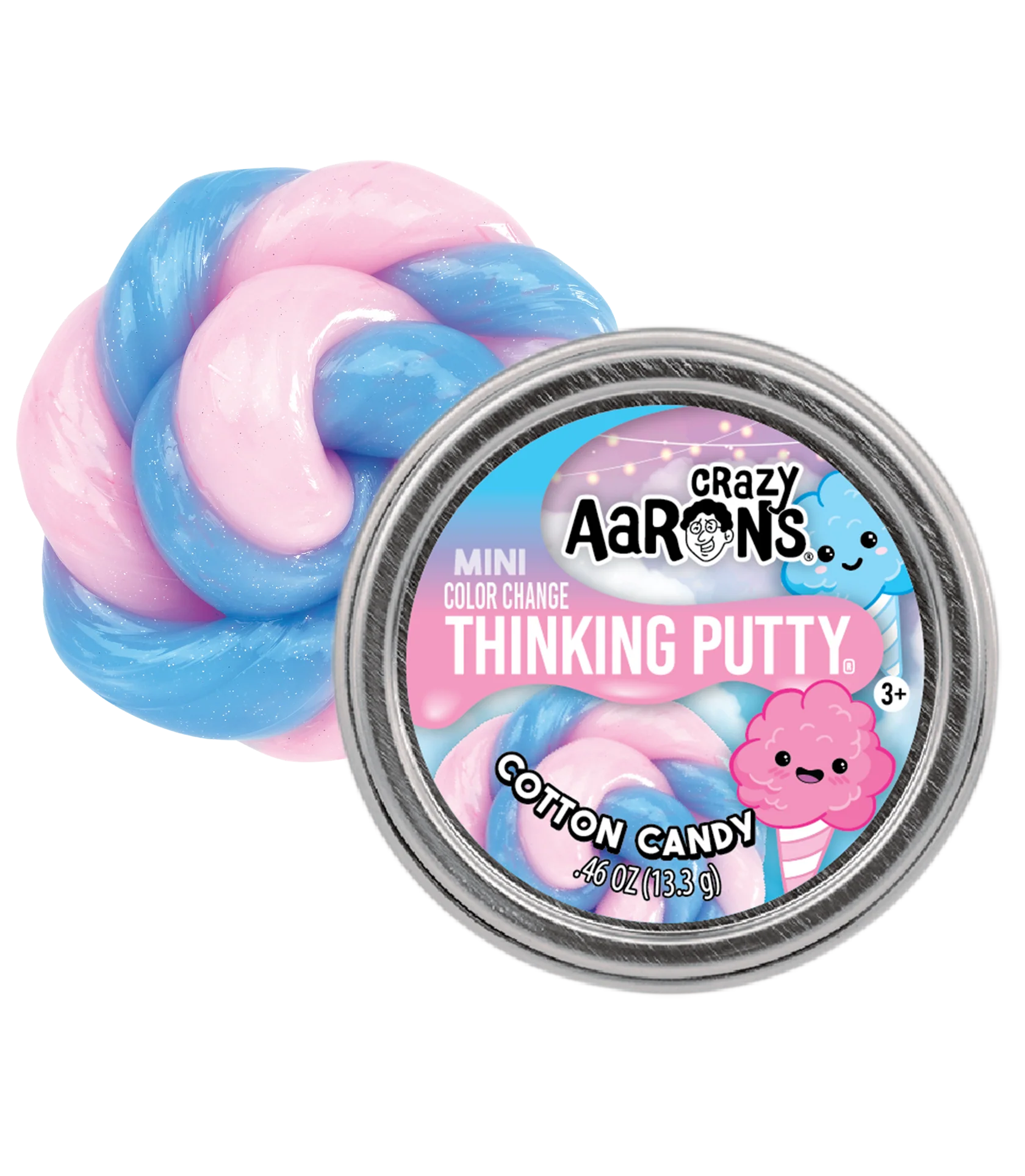 Have you ever been to a summer fair? They have rides, games where you can win prizes, and they ALWAYS have a cotton candy machine! You usually must choose between a pink or blue cotton candy, but with Cotton Candy Mini Thinking Putty, you can make both! This putty starts off as blue and gradually warms to pink!