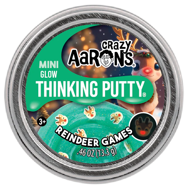 Mini Reindeer Games Thinking Putty! This merry green putty shimmers with golden sparkles and playful reindeer clay pieces. And for a magical surprise—turn off the lights and watch their noses glow bright red!