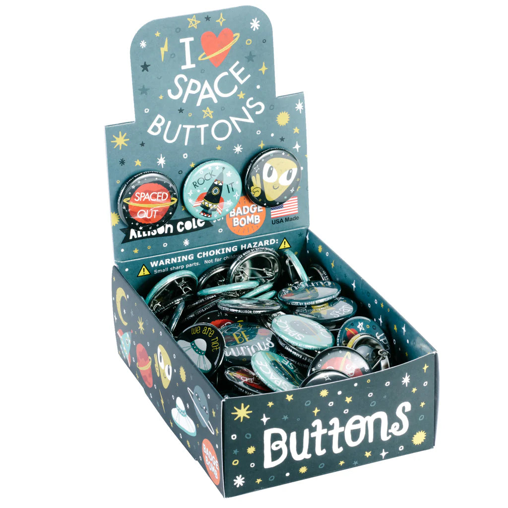 Badge Bomb buttons are made in Portland, Oregon with recycled paper and steel, and the boxes themselves are printed on 100% post consumer recycled paper. They are 1.25 inches in diameter.