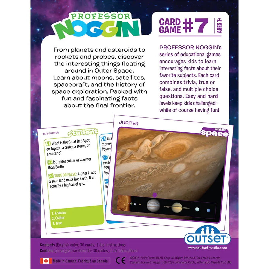 The Professor Noggin series of educational card games encourages kids to learn interesting facts about their favorite subjects - like Outer Space! Each of the thirty game cards combines trivia, true or false, and multiple choice questions. A special three-numbered die is included which adds an element of unpredictability. Easy and hard levels keep kids interested and challenged - while of course having fun!