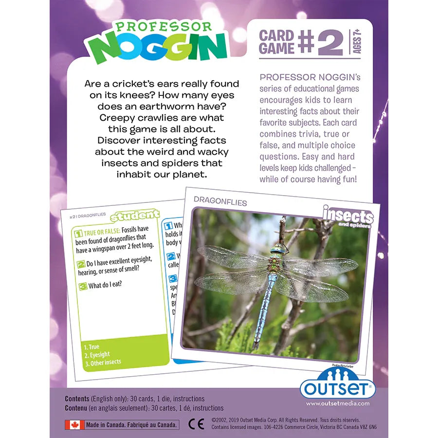 The Professor Noggin series of educational card games encourages kids to learn interesting facts about their favorite subjects - like Insects and Spiders! Each of the thirty game cards combines trivia, true or false, and multiple choice questions. A special three-numbered die is included which adds an element of unpredictability. Easy and hard levels keep kids interested and challenged - while of course having fun!
