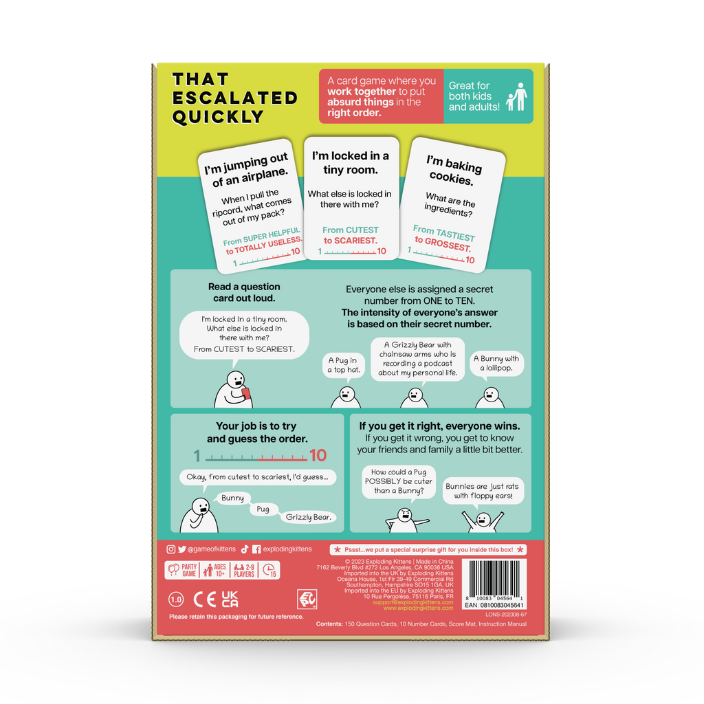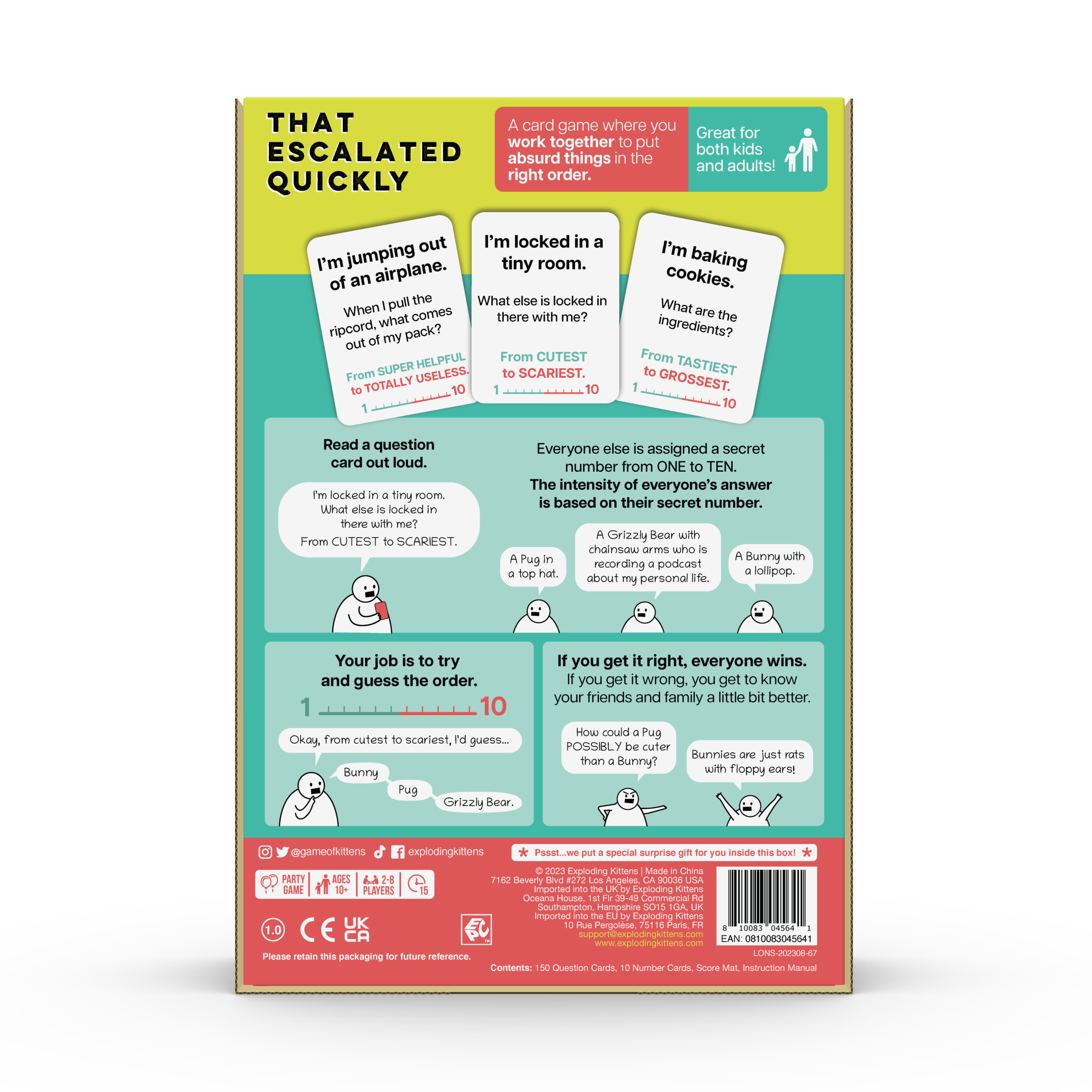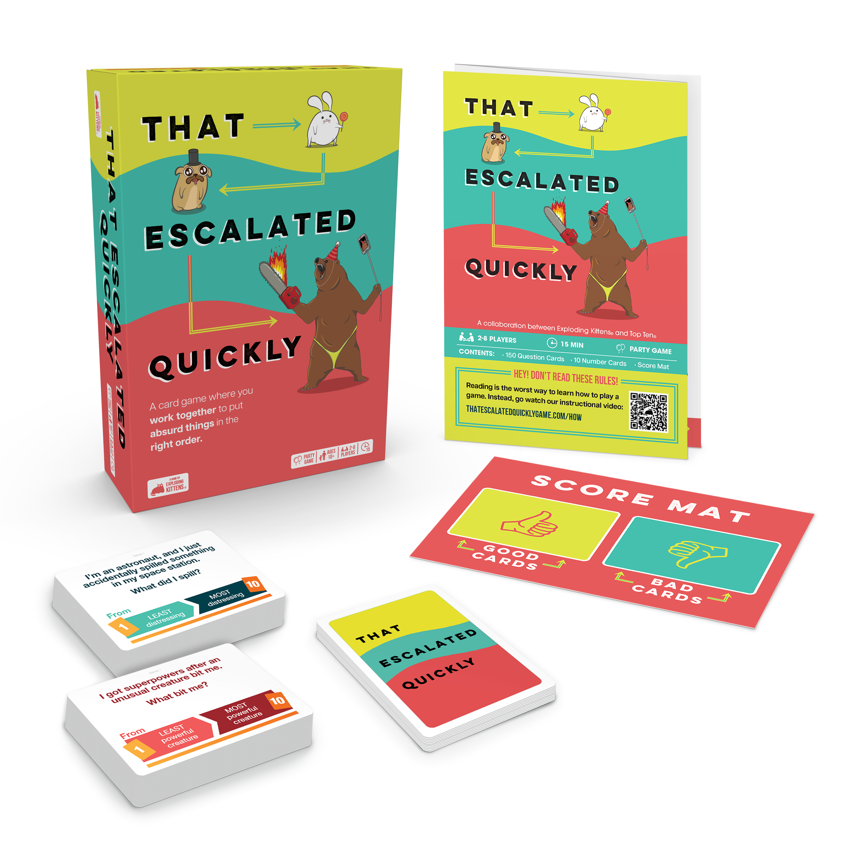 This is a reimagined version of "Top Ten", a 2023 Spiel Des Jahres nominee by Cocktail Games. It's a cooperative card game where you work together to sort out a bunch of nonsense. Score points by thinking like your teammates and order your cards in the correct ascending order. Read the prompts and admire the hilarious creativity of your friends.