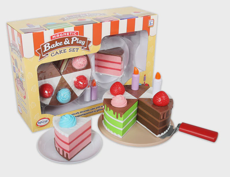 The Magnetic Bake and Play Cake Set serves up double the fun with six magnetic slices that flip from white frosting to chocolate icing for endless pretend-play possibilities. Little bakers can decorate their creations using the included lazy susan, strawberries, parfaits, candles, plates, and spatula. Ideal for tea parties, play kitchens, and imaginative role play. Designed with toddlers and preschoolers in mind, this 16-piece set is easy for small hands to stack, build, and customize, and it stores away quickly for mess-free clean-up. A delightful way to spark creativity while supporting motor skills and social interaction, this cake set is as educational as it is adorable.