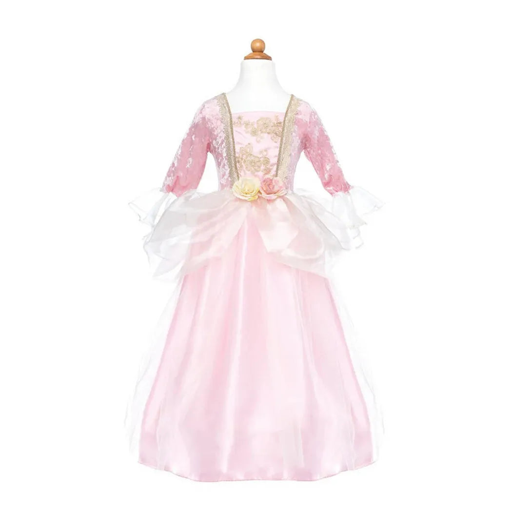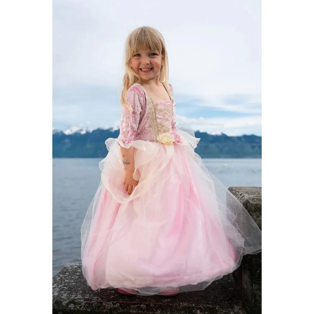 Our golden rose princess dress was such a success that we are now introducing a pink rose princess dress! This dress is accented with gold trim, shimmering organza, and two layers of tulle over top of the pink satin hoop skirt. The sleeves and bodice are made of soft crushed stretch velour - the velour has spandex for comfort and size flexibility. This dress is every princess’s dream!