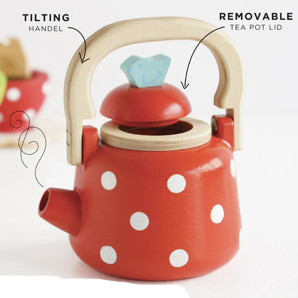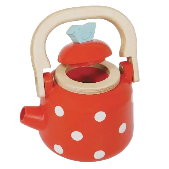 Pop the kettle on. Serve up a lovely traditional cuppa with this delightful, vintage style wooden tea pot with detachable lid. Painted in the prettiest bold red and decorated with white polka dots, little hosts will love serving up their friends or soft toy pals, inspiring interactive learning through play. This durable toy makes a great accessory paired with a play kitchen. Includes kettle only.