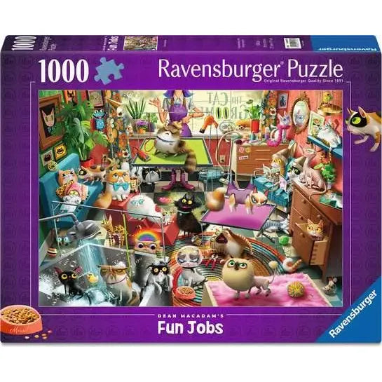 It’s controlled chaos at “The Cat Groomer” as the kitties are pampered to the max in this Ravensburger 1000-piece jigsaw puzzle by artist Dean MacAdam. Waiting your turn for “The Cat Groomer” to work her magic is no problem when there are so many spa treatments to enjoy! This frisky and fun puzzle shows pampered felines sitting under the hairdryer, catching up on the latest kitty gossip. One cat relaxes with a cucumber eye mask, another receives a traction treatment, and love is in the air! Of course, not everyone is thrilled — the cats being bathed look less than pleased. A purr-fect gift for any cat lover or puzzle enthusiast!