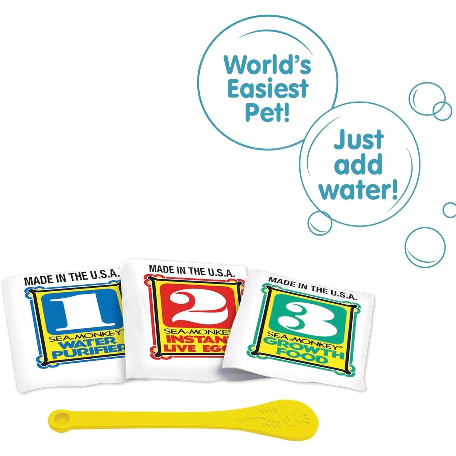 This Sea-Monkey starter set introduces you to the wet, wonderful, amazing Sea-Monkey world! Set includes 3 pouches; water purifier, instant live eggs, growth food, magnifier, feeding spoon and illustrated instructions. Measures 6 x .25 x 10 inches in package.