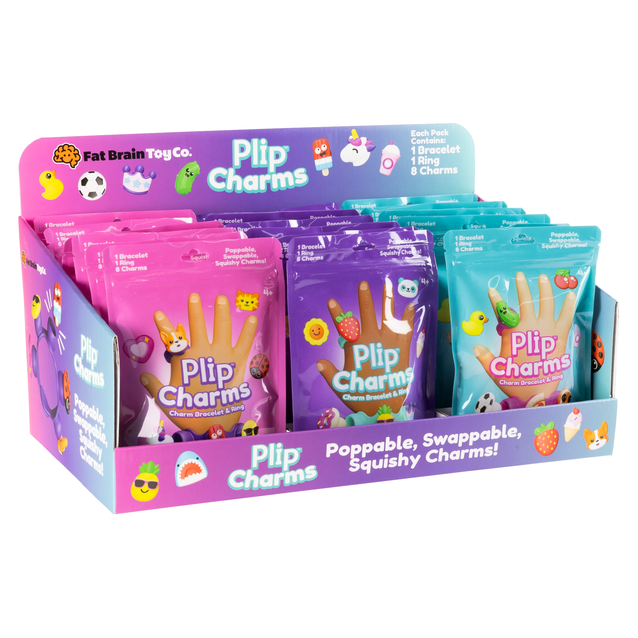 Pick your favorite charms and fit them into the sockets of the silicone bracelet and ring. It's a playful way to accessorize - on your wrists and fingers or even on a backpack - and when you pull them out, they make the most satisfying "POP!" Each set comes with a bracelet, a ring, and eight unique charms. Collect them all. Trade them with your friends. Let your personality POP with Plip Charms!