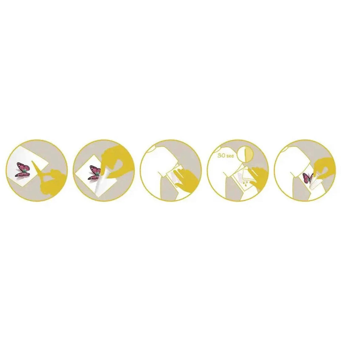 - Cut out a design, remove the protective sheet and apply the design to your child's skin. Then rub for 30 seconds and gently remove the translucent foil.