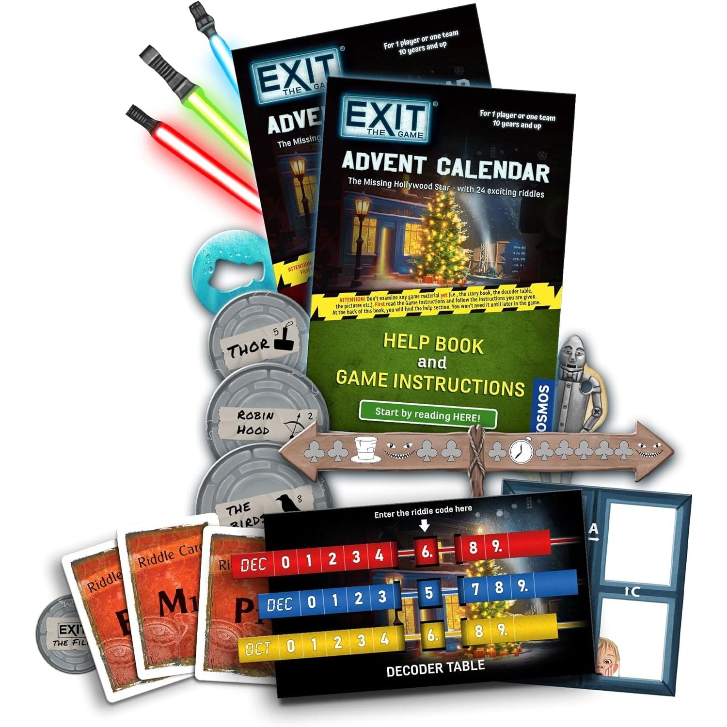 Do you have the courage to follow the trail and go deep behind the scenes of the film studio? This advent calendar is an EXIT game and an adventure story in one: To find the missing star, you must open a little calendar door every day. Behind each, you will find an exciting new riddle, the solution to which will help you to move onto the next day. Only if you follow the clues and solve all 24 riddles, will you uncover the secret and save the Christmas blockbuster.