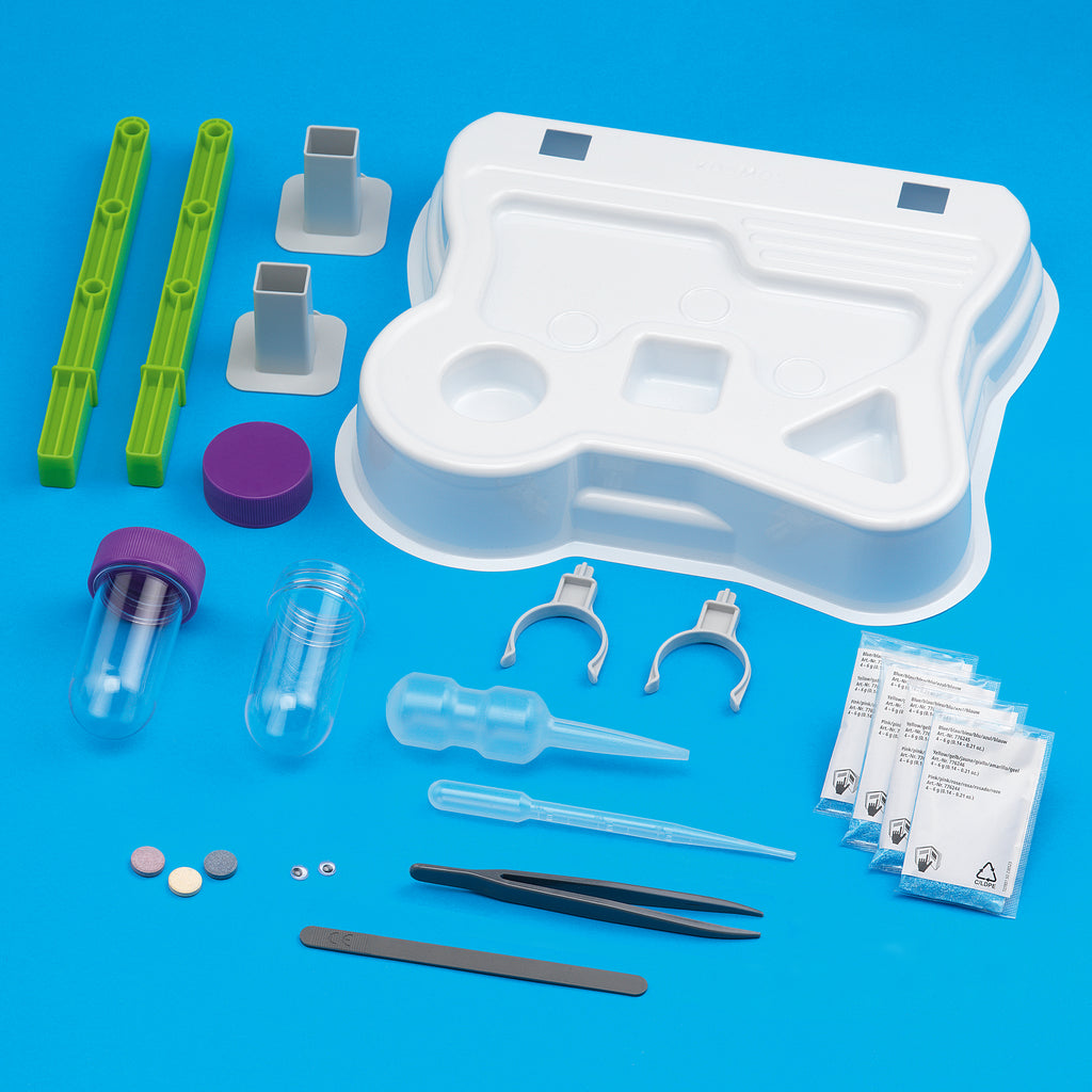 The durable plastic base station creates a dedicated workspace and provides a home for the pipettes, tweezers, spatula, test tubes, and other tools and equipment included in the kit. A 28-page, full-color manual brings each experiment to life with colorful illustrations, step-by-step instructions, and simple explanations of the amazing principles at work.