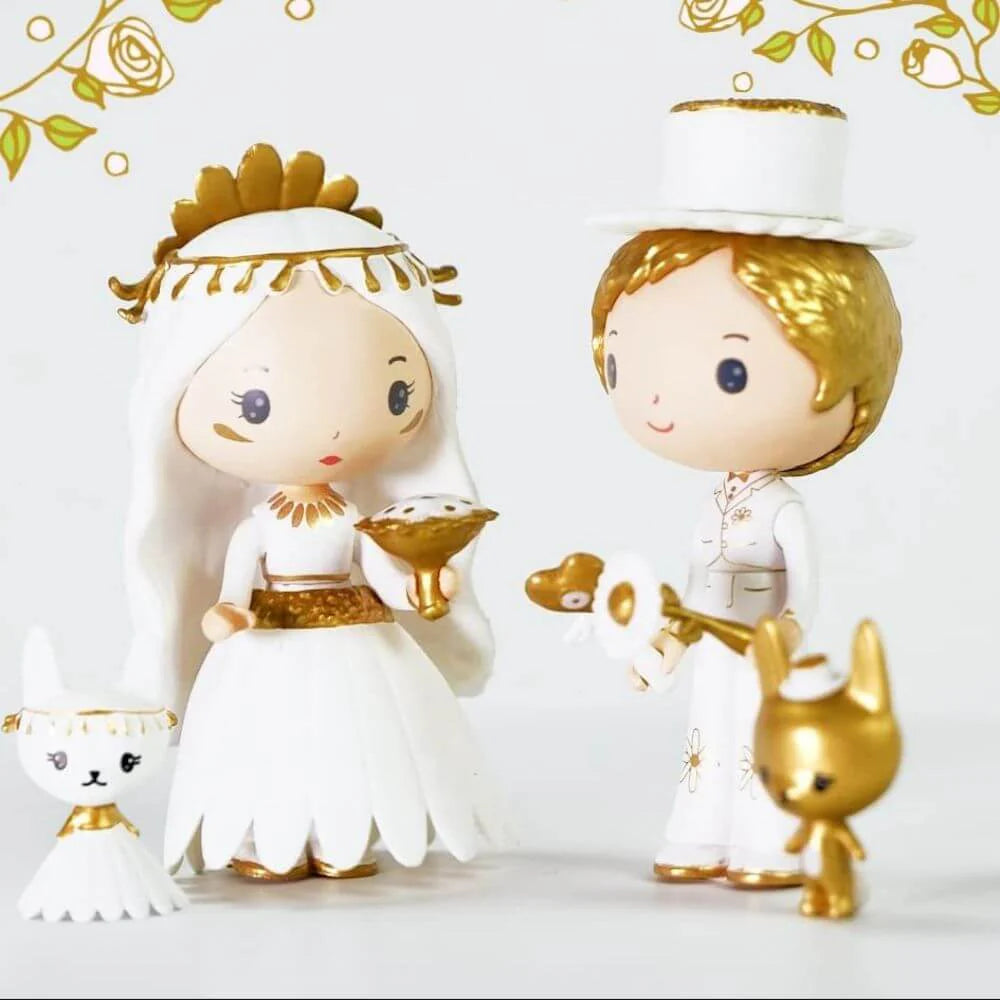 Marguerite and Léopold, the bride and groom, accompanied by their inseparable companions Margo and Léo, form a pretty duo of white and golden figurines belonging to the poetic universe of the Tinyly. Articulated figures with delicate features to display, collect or weave into stories and fabulous adventures!