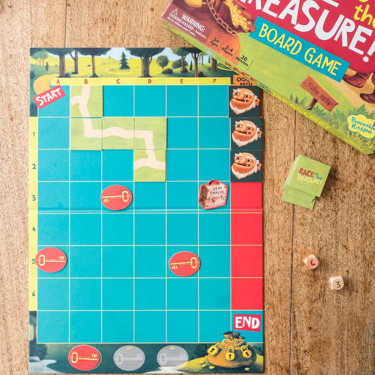 Players try to beat the ogre to the treasure by creating a path from START to END. Along the way they need to collect three keys to open the treasure. Players strategize, cooperate, and build the path together. If they do it before the ogre gets there, they all win!