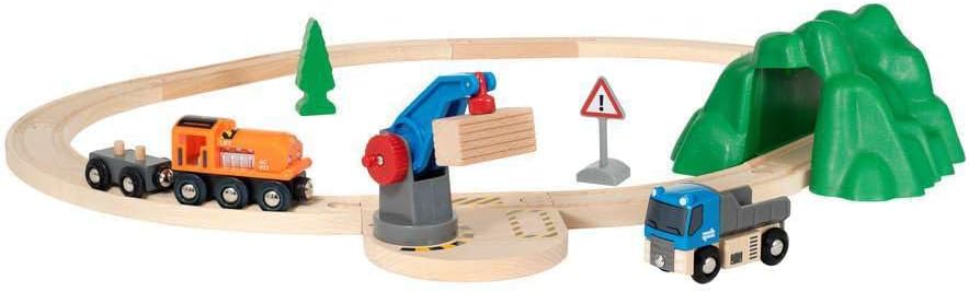 Gear up for your first BRIO World adventure with the 36028 Starter Lift & Load Set. This 14-piece railway set features classic BRIO play with focus on lifting and loading cargo between trains, cranes and trucks. Place the wooden cargo load on the back of the orange cargo train and take a lap around the iconic BRIO wooden tracks. Then use the magnet on the low level crane to pick up the cargo, swing it around to be loaded onto the blue truck and off you go.