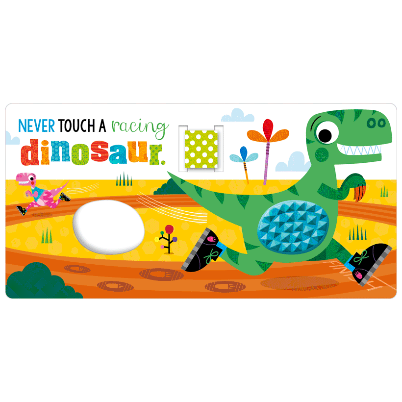 Join the playful dinosaurs in this exciting addition to our bestselling Never Touch series. The adorable mini format is perfect for on-the-go adventures. Use the handy strap and clip to attach to strollers, bags, and highchairs. The sturdy pages and bumpy silicone touches are sure to keep busy little hands entertained.